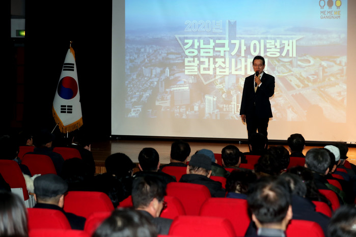 정순균 서울 강남구청장이 14일 논현1문화센터에서 지역내 22개동 주민들이 참석한 가운데 예산보고회를 개최하고 구의 예산집행계획에 대해 주민들의 의견을 청취했다. 사진은 올해 추진하는 사업들에 대해 소개하고 있는 정 구청장 모습. (사진제공=강남구청)