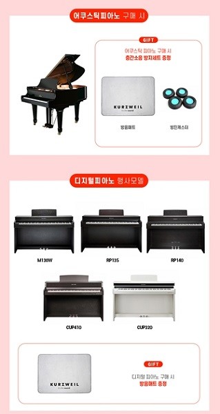 이번 정기세일 주요 모델로 입문용 디지털피아노 RG115, RP115 패키지 구성으로 준비되어 행사 중이며, 중급자를 위한 전자피아노 커즈와일 RG120, RP120 모델도 한정 초특가로 진행된다.