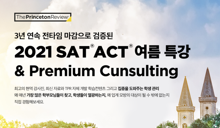 2021 여름특강은 13주 과정으로 오는 31일 개강 예정이다. 개인별 일정에 맞춘 주차별 등록이 가능하며, 평일 무료상담 예약 진행 후 당일등록 5% 할인도 주어진다. 기존에 다른 교육기관에서 SAT 및 ACT를 학습하는 학생이 프린스턴리뷰 학원으로 환승 시 수강료 및 교재 혜택도 제공한다.