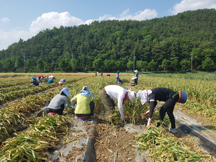합천군 박상현 쌍책면장과 박무곤 체육시설과장, 김동중 농업지도과장, 공무원 등 25명은 28일 본격적인 영농철을 맞아 일손 부족으로 마늘 수확에 어려움을 겪고 있는 쌍책면 고령 농가의 마늘 수확에 동참해 구슬땀을 흘렸다.