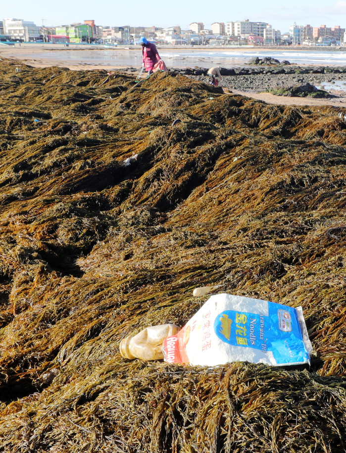 19일 오전 제주시 이호해수욕장에서 예년보다 일찍 밀려온 '바다의 불청객' 괭생이모자반 수거를 위해 제주시 관계자들이 괭생이모자반에 섞인 중국 해양쓰레기를 분리하고 있다.