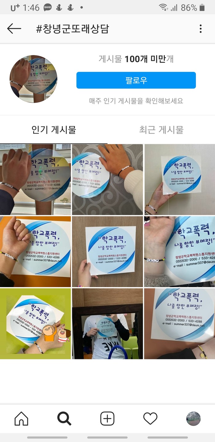 또래상담자는 창녕군학교폭력원스톱지원센터에서 배부한 HELP 팔찌 만들기 키트를 완성 후 인증샷을 찍고 자신이 사용하는 SNS에 학교폭력예방 홍보 스티커와 함께 게시함으로써 청소년의 눈높이에 맞는 새로운 방식의 캠페인을 실시하고 비폭력적인 학교문화를 전파하는 계기를 마련했다.