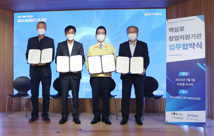 서울 강남구는 지난 1일 역삼동 포스코 창업지원센터에서 열린 창업지원 협약식에서 창업지원 업무협약을 맺었다. 구는 (주)포스코, (재)아산나눔재단, (사)한국엔절투자협회와 함께 ▲기관 간 시설·공간 공유 ▲입주기업 창업프로그램 참여지원 ▲스타트업 공동 연말행사 등을 추진할 예정이다. 사진은 이날 정순균 구청장(오른쪽에서 두 번째)이 협약식에서 기념촬영을 하는 모습.(사진제공=강남구청)