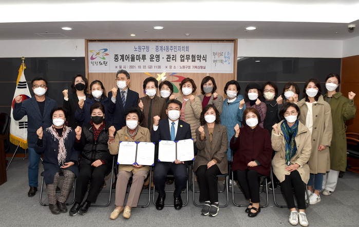 오승록 서울 노원구청장은 최근 중계어울마루 공동체공간 운영·관리 협약식에 참석했다. 이날 협약식은 중계어울마루를 마을공동체 커뮤니티 공간으로 활용하고, 운영·관리를 주민자치회에 위탁하기 위해 진행됐다. 사진은 협약식에서 오 구청장(앞줄 가운데)과 관계자들이 기념촬영을 하는 모습. (사진제공=노원구청)