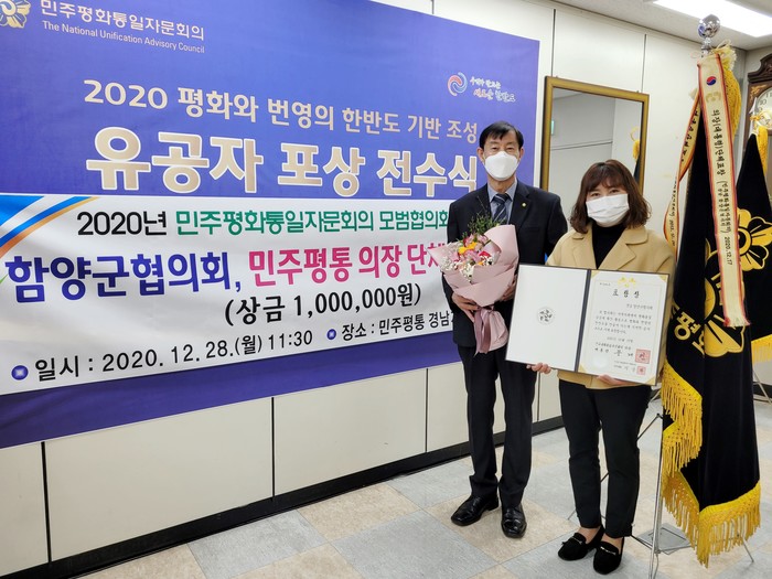 12월 28일 민주평통 경남지역회의(경남도청 신관)에서 열린 민주평통 2020’ 모범 협의회 표창 시상식에서 최우수 협의회에 주어지는 단체 표창 을 경남에서 유일하게 함양군협의회 1곳만 민주평통 의장 단체표창(민주평 통 의장: 대통령)을 받는 영광을 차지했다.