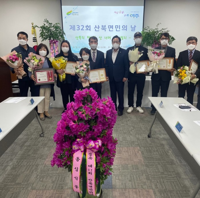 경기 여주시 산북면은 최근 비대면 방식으로 '제32회 산북면민의 날' 기념식을 개최했다. 이날 행사는 면장 기념사·축사·유공자 포상 순으로 진행됐다. 사진은 이날 표창장을 받은 유공자 및 관계자들이 기념촬영을 하는 모습. (사진제공=여주시청)