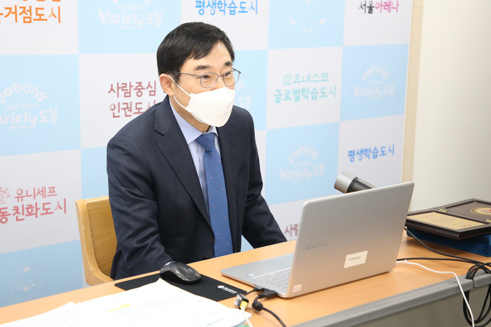 서울 도봉구는 최근 ‘지속가능발전 지방정부협의회 2021 상반기 정기총회’를 온라인 영상회의로 진행해 ‘지속가능발전 관련법 제·개정과 지방정부의 입장’이라는 주제로 열띤 토론을 펼쳤다. 사진은 이동진 구청장이 토론에 참여하고 있는 모습. (사진제공=도봉구청)