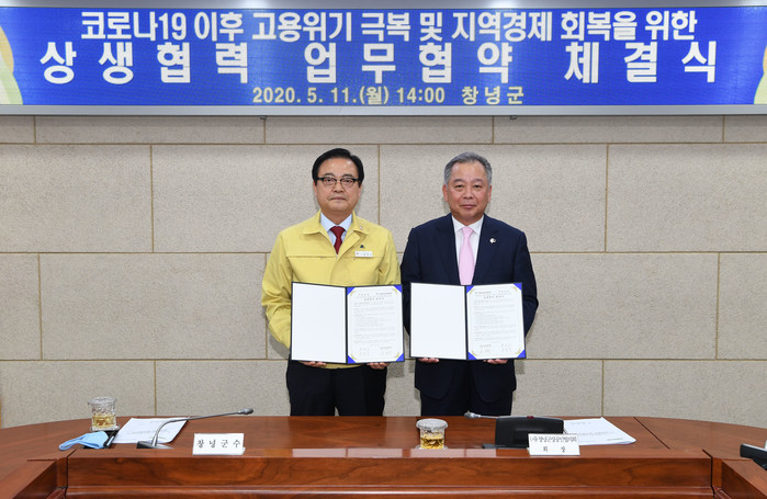 창녕군(군수 한정우)은 코로나19 이후 고용위기를 극복하고 지역경제를 회복하기 위해 ㈔창녕군상공인협의회(회장 윤병국)와 업무협약을 체결했다.