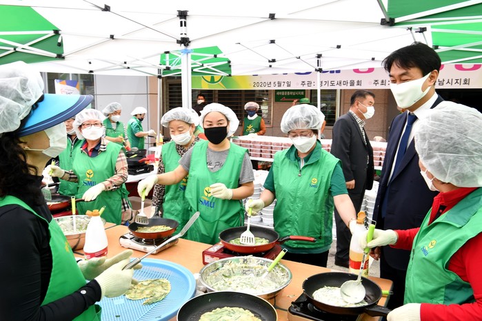 새마을운동 경기 하남시지회가 7일 새마을지도자 40여명이 참여한 가운데 홀몸노인 등 지역내 취약계층 400가구에 밑반찬을 만들어 전달하는 '우리동네 행복밥상' 사업을 추진했다. 사진은 밑반찬을 만드는 지도자들을 격려하는 김상호 시장의 모습. (사진제공=하남시청)