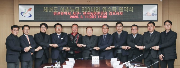 인천 서구가 지역내 세어도에 활력을 불어넣고 지역기반시설 확충과 주민소득 증대를 위해 11일 한국농어촌공사 김포지사와 '세어도 어촌뉴딜 300사업 위·수탁 협약'을 체결했다. 사진은 이재현 구청장(왼쪽에서 세 번째)과 관계자들의 기념촬영 모습. (사진제공=서구청)