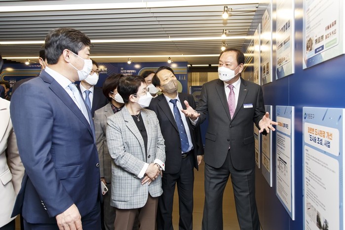 유동균 서울 마포구청장이 25일 균형잡힌 미래와 일자리 혁신을 위한 ‘2021 좋은 일자리 포럼’에 참석해 일자리 홍보부스를 둘러보고 지역균형뉴딜 선언식에 자리를 함께했다. 사진은 구 홍보부스에서 유 구청장(오른쪽)이 ‘디지털뉴딜 정책’에 대해 소개하는 모습. (사진제공=마포구청)