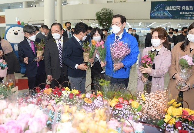 이번 행사는 코로나19 장기화로 어려움을 겪고 있는 화훼업계를 지원하고 꽃 문화를 확산시키기 위해 마련됐으며, 이용섭 시장이 참여농가와 함께 직접 시민들과 공직자에게 꽃을 판매했다.