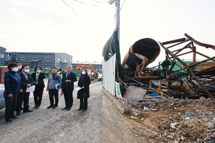 | ▲ 화재 현장을 둘러보고 있는 경제환경위원회 위원들. (사진제공=화성시의회) |