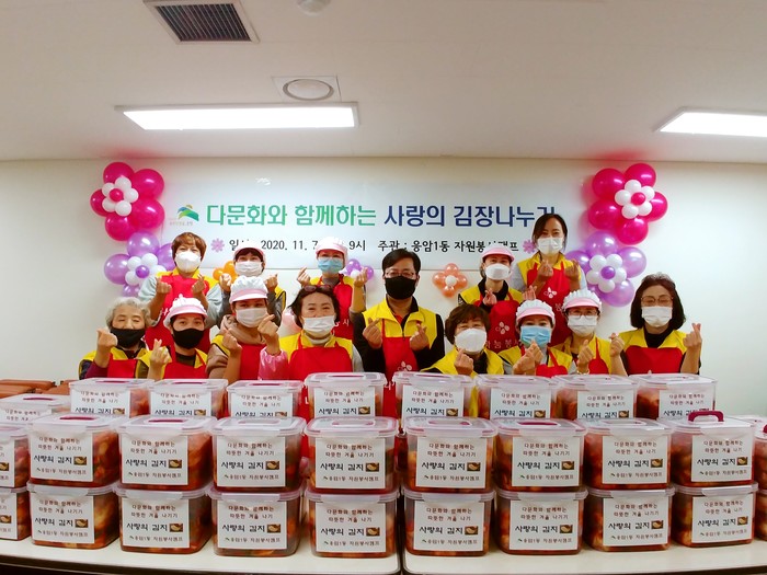 서울 은평구 응암1동 자원봉사캠프는 최근 응암1동 주민센터와 함께 ‘다문화와 함께하는 따뜻한 겨울나기, 사랑의 김장나누기’ 행사를 개최해 김장김치 180kg을 담가 다문화가정 및 한부모가정 등 30여가구에 전달했다. 사진은 이날 참여한 봉사자들과 관계자들이 기념촬영을 하는 모습. (사진제공=은평구청)