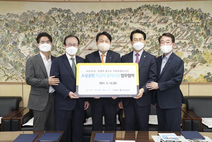 서울 종로구는 지난 14일 서울신용보증재단·우리은행·신한은행·하나은행과 소상공인 저금리 융자지원을 위한 업무협약을 체결했다. 구와 3개 은행은 서울신용보증재단에 총 16억원을 1대 1 매칭 출연하고 소기업 등에 최대 2000만원까지 저리 융자를 실시한다. 사진은 협약식에서 김영종 구청장(오른쪽 두 번째)과 관계자들이 기념촬영을 하는 모습. (사진제공=종로구청)