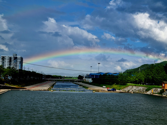 17일 오후 4시 30분쯤 의령읍 의병교에서 바라 본 동쪽하늘 나지막히 쪽빛 하늘과 뭉게구름 사이로 빨주노초파남보 색깔의 선명한 무지개가 나타 나 보는 사람들의 탄성을 자아냈다.