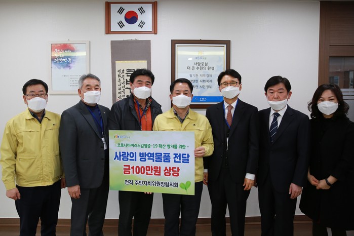 경기 수원시 장안구 전직 주민자치위원장협의회는 지난 9일 장안구청을 방문해 코로나19 예방과 확산 방지를 위한 100만원 상당의 방역물품 100개를 전달했다. 사진은 전달식에 참석한 관계자들이 기념촬영을 하는 모습. (사진제공=장안구청)