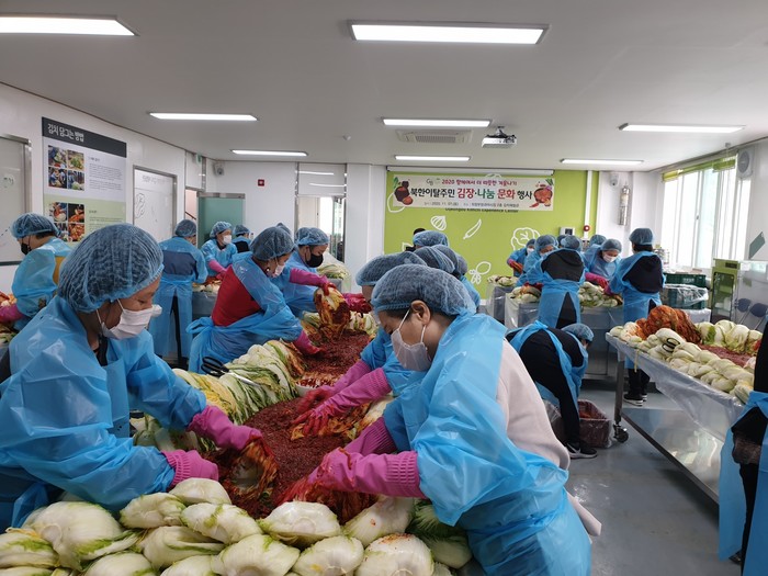 경기 의정부시는 지난 7일 의정부청과야채시장 내 김치체험관에서 지역내 북한이탈주민들이 참여하는 ‘김장·나눔 문화 행사’를 개최했다. 이날 행사는 북한이탈주민 50여명이 참여해 한국의 김장 문화를 체험하는 방식으로 진행됐으며, 손수 담근 김장김치는 지역내 북한이탈주민 취약계층 200가구에 전달됐다. 사진은 참여자들이 김장을 하고 있는 모습. (사진제공=의정부시청)