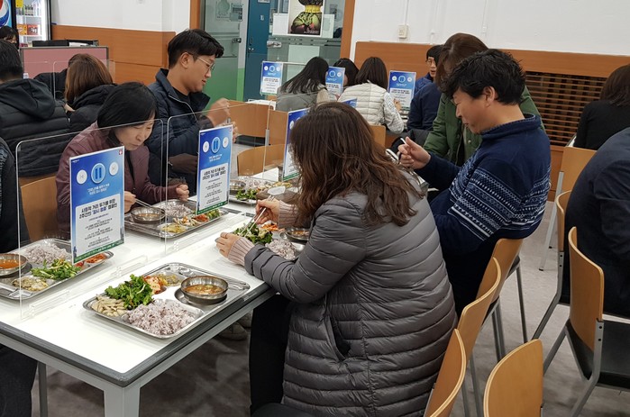 강북구가 코로나19의 직장내 전파를 차단하기 위해 사회적 거리두기 운동의 일환으로 최근 구청 구내식당에 가림막을 설치하고 거리두기 홍보물을 부착했다. 사진은 구청 직원들이 홍보물이 부착된 가림막을 사이에 두고 식사하는 모습. (사진제공=강북구청)