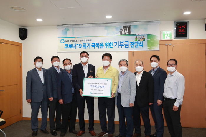 서울 관악구가 지난 20일 MG새마을금고 관악구협의회로부터 코로나19 위기 극복성금 1000만원을 기부받았다. 성금은 취약계층 지원을 위해 서울시 사회복지 공동모금회에 지정 기탁됐다. 사진은 기탁식에서 박준희 구청장(가운데)과 관계자들이 기념촬영하는 모습. (사진제공=관악구청)