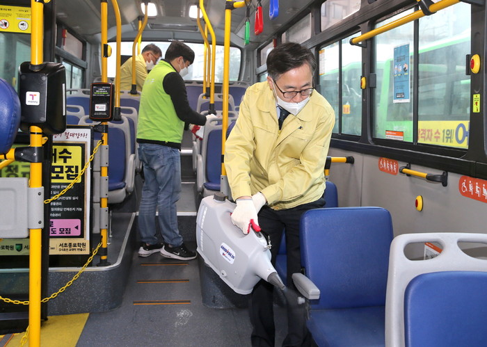 유성훈 금천구청장은 최근 금천구 최대 운수업체인 범일운수를 찾아 버스 내부를 직접 소독했다. 이어 버스정류장과 금빛공원 등 주민 다중이용시설을 대상으로 방역을 실시했다. 사진은 유 구청장이 버스내부를 소독하고 있는 모습. (사진제공=금천구청)