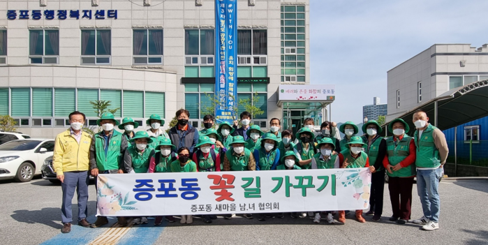 경기 이천시 증포동 새마을협의회는 최근 증포동행정복지센터 부근과 증포교차로 일원에서 증포동 상징 꽃인 메리골드 7000본을 식재했다. 사진은 이날 참여한 봉사자들이 기념촬영을 하고 있는 모습. (사진제공=이천시청)