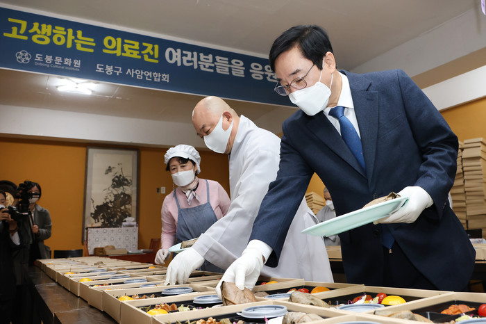 이동진 서울 도봉구청장은 25일 ‘2021년 도봉산 사찰음식전’에 참여해 코로나19 의료진과 관계자·사회적 소외계층에 전달하는 나눔 도시락을 함께 포장하고, 관계자들을 만나 격려의 말을 전했다. 사진은 이 구청장(오른쪽)이 도시락을 포장하고 있는 모습. (사진제공=도봉구청)