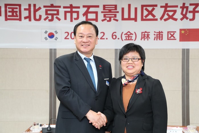 최근 서울 마포구 자매결연 도시 중국 베이징시 석경산구 대표단이 우호협력 증진과 교육, 문화 및 관광 분야에서 다양한 협력방안에 대한 논의를 위해 구를 방문했다. 사진은 유동균 구청장(왼쪽)과 천팅팅 석경산구 부구장이 기념촬영하는 모습. (사진제공=마포구청)