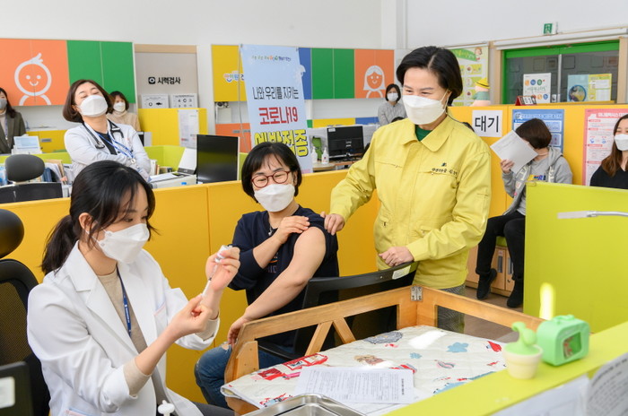 서울 양천구가 지난 8일 방역과 역학조사 등 최일선에서 현장대응 업무를 수행하는 1차 대응요원들에 대한 백신접종을 시작했다. 보건소에서는 이번주 금요일까지 소방관을 포함해여 1차 대응요원 총 252명에 대해 접종을 마무리할 계획이다. 사진은 김수영 구청장(오른쪽)이 1차 대응요원 백신접종을 지켜보고 있는 모습. (사진제공=양천구청)