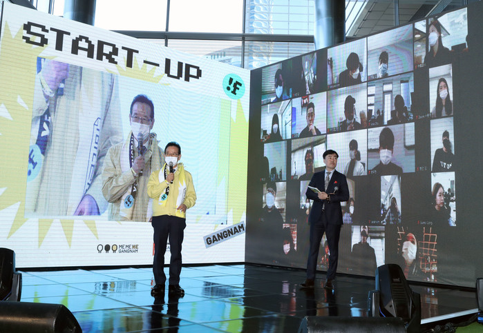 정순균 서울 강남구청장은 최근 코엑스에서 열린 ‘IF2020 GANGNAM’ 블랙프라이데이 행사에 참석했다. 이 행사는 온·오프라인으로 진행, 다수의 스타트업 대표 및 청년이 비대면으로 참여했다. 사진은 이날 행사에서 정 구청장이 축사를 하고 있는 모습. (사진제공=강남구청)