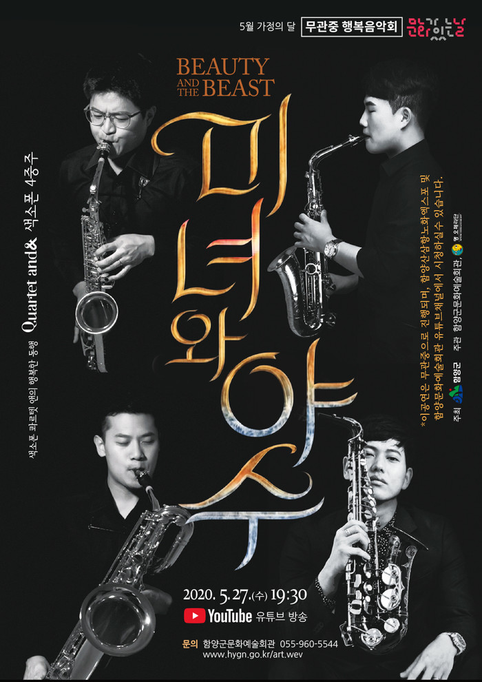 함양문화예술회관은 ‘색소폰 콰르텟 앤의 미녀와 야수’를 5월27일 오후 7시 30분 함양산삼항노화엑스포 채널을 통하여 방송한다.
