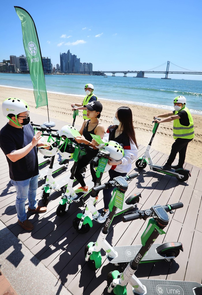 라임코리아의 라임 안전 도우미들이 21일 부산 광안리 해수욕장에서 라이더들에게 안전한 주행 방법과 전동킥보드 관련 현행 법규에 대한 교육을 하고 있다.