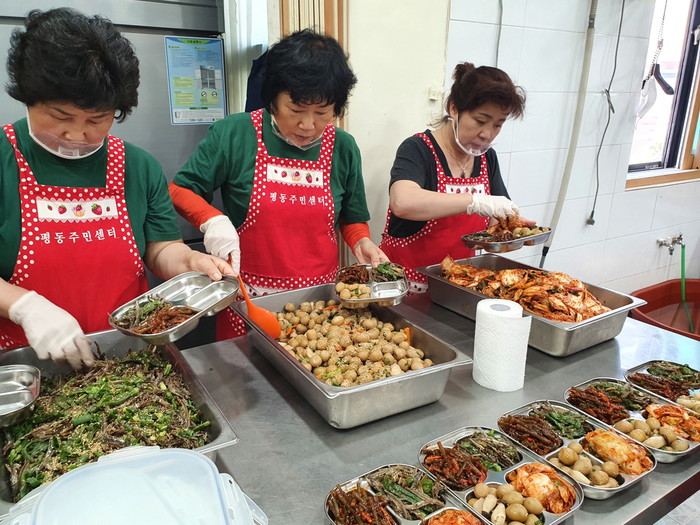 경기 수원시 권선구 평동 새마을부녀회는 지난 9일 코로나19 장기화로 어려움을 겪고 있는 이웃을 위해 사랑의 반찬 나눔 봉사활동을 진행했다. 이날 새마을부녀회원들이 만든 겉절이 등 4가지 종류의 반찬은 홀몸노인 42가구에 전달됐다. 사진은 반찬을 만들고 있는 모습. (사진제공=권선구청)