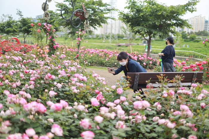 금천구 시흥대교 인근 금천한내장미원의 사계장미 100만송이가 만개해 아름다운 풍경을 자아내고 있다. 구는 지난해 서울시로부터 12억을 지원받아 독산보도교~시흥대교 인근 장미원까지 생태복원과 연계한 약 3000㎡ 규모의 장미원 조성사업을 완료했다. 사진은 최근 안양천 금천한내장미원에서 주민이 장미 사진을 찍고 있는 모습. (사진제공=금천구청)