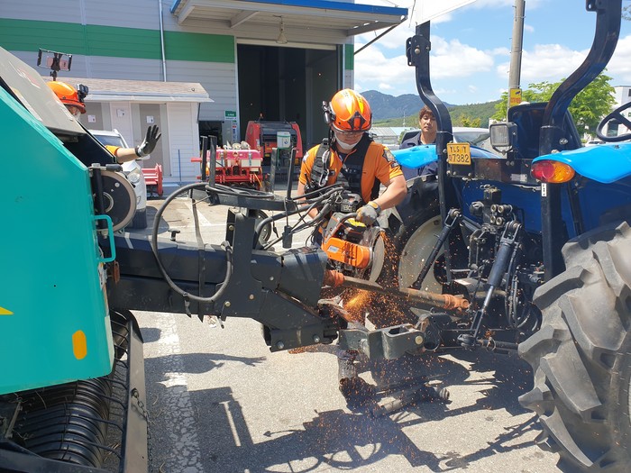 이번 훈련은 합천군 농업기술센터의 협조를 받아 진행되었으며, 농기계의 구조원리 이해, 기본 조작법 숙지 및 가상사고 설정 인명구조 실습 등을 통해 농기계 사고 발생 시 효율적인 대응체계 구축을 위해 마련됐다.