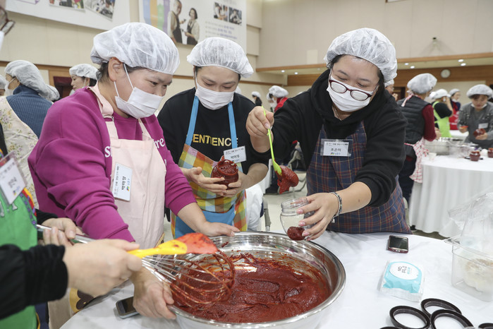 성동구는 최근 구청 3층 대강당에서 학부모들을 대상으로 ‘GMO(유전자 조작) 없는 식생활 교육 및 전통장 담그기 체험’ 행사를 개최했다. 이날 고은정 전통장 명인을 초청해 장 만드는 법을 함께 배웠다. 사진은 함께 장을 담그는 모습.(사진제공=성동구청)