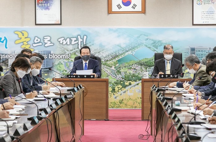 노현송 서울 강서구청장은 3일 확대간부회의에 참석해 부서별 주요업무에 대한 보고를 받았다. 사진은 회의를 주재한 노 구청장(가운데 왼쪽)이 2021년 업무계획의 내실 있는 준비를 강조하며 겨울철 종합대책을 주문하고 있는 모습. (사진제공=강서구청)