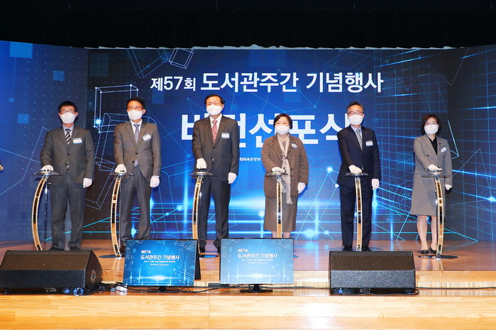 유성훈 서울 금천구청장이 지난 12일 국립중앙도서관에서 개최된 제57회 도서관주간 기념행사에 참여했다. 사진은 기념행사에서 (사)책읽는도시협의회장인 유 구청장(오른쪽 두 번째)이 비전선포를 하고 있는 모습. (사진제공=금천구청)