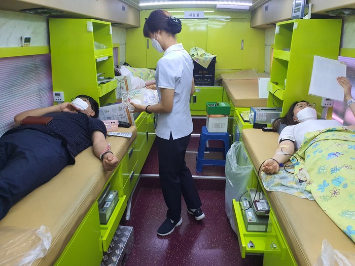 전남 순천교육지원청은 지난 9일 청사내 주차장에서 코로나19로 인한 혈액 수급위기 극복을 위해 대한적십사자 광주전남혈액원과 함께 단체 헌혈을 통한 사랑 나눔을 실천했다. 이번 단체 헌혈에는 30여명의 직원들이 참여했다. 사진은 직원들이 헌혈하는 모습. (사진제공=순천교육지원청)
