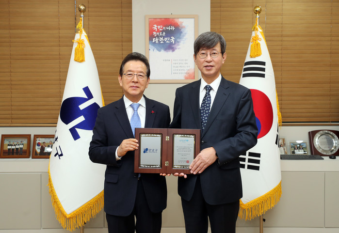 이기철 유니세프한국위원회 사무총장이 유니세프한국위원회 후원 15주년을 기념해 2004년부터 영양실조 치료 및 식수위생 지원을 위해 총 6억3000만원을 유니세프한국위원회에 기부해 온 강남구에 감사패를 전달했다. 사진은 감사패를 받은 정순균 구청장(왼쪽)이 기념촬영을 하고 있는 모습. (사진제공=강남구청)