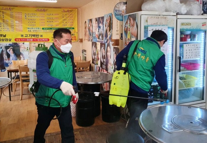 서울 서대문구 홍제3동 새마을지도자협의회가 코로나19 '심각' 단계 격상 이전인 지난 2월15일부터 지역내 놀이터, 식당, 공중화장실 등 다중이용시설을 돌며 매일 방역 소독작업을 펼치고 있다. 사진은 최근 지역내 식당을 소독하고 있는 회원들의 모습. (사진제공=서대문구청)