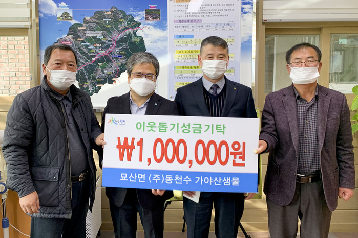 합천군 묘산면 반포마을에 소재한 ㈜동천수 가야산 샘물(대표 박철호)에서 묘산면(면장 홍석천)에 관내 어려운 이웃을 위해 써달라며 성금 일백만원을 기탁했다.