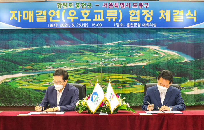 도봉구는 강원 홍천군과 지난 25일 우호교류 협정을 체결하고 향후 지역 특산품 교류를 통한 상호 지역경제 활성화 및 문화·관광교류 촉진 등 실질적 교류 협력을 다짐했다. 사진은 협정식에서 이동진 구청장(왼쪽)과 허필홍 군수가 서명을 하는 모습. (사진제공=도봉구청)