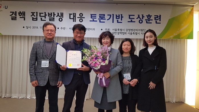 서울 광진구가 최근 중구 프레지던트호텔에서 열린 ‘제2기 결핵관리 종합계획 평가’에서 최우수구에 선정돼 기관표창을 수여받았다. 사진은 기관표창을 수여받은 광진구 보건소장(가운데)과 직원들이 기념촬영을 하는 모습. (사진제공=광진구청)