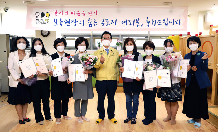 서울 강남구는 최근 스승의 날을 기념해 보육현장 최전선에서 건전한 보육환경 조성을 위해 노력한 지역내 어린이집 모범직원 26명을 선정해 표창장을 전달했다. 사진은 수여식에서 정순균 구청장(가운데)이 보육직원 감사장 수상자들과 기념촬영을 하는 모습. (사진제공=강남구청)