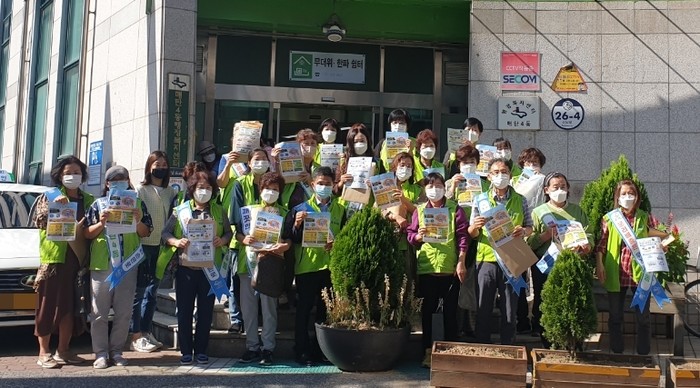 경기 수원시 영통구 매탄4동에서는 최근 ‘분리배출 실천 홍보’ 캠페인을 진행했다. 이번 캠페인은 코로나19 확산으로 인해 1회용품 사용량이 늘어남에 따라 올바른 쓰레기 분리배출을 통해 쾌적한 거리환경을 조성하고 자원을 보존하기 위해 실시됐다. 사진은 이날 참가자들이 기념촬영을 하고 있는 모습. (사진제공=영통구청)