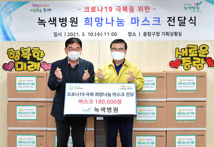 서울 중랑구는 10일 녹색병원으로부터 코로나19 극복을 위한 마스크 18만장을 전달받았다. 이 마스크는 면목동 6개동 주민센터에 3만장씩 전달됐으며, 지역내 홀몸노인·장애 가구 등에 지원될 예정이다. 사진은 전달식에서 류경기 구청장(오른쪽)과 임상혁 원장이 기념촬영을 하고 있는 모습. (사진제공=중랑구청)