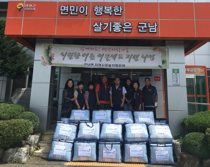 경기 연천군 군남면 지역사회보장협의체는 21일 저소득 취약계층 24가구에 여름 이불 세트(144만원)를 전달했다. 이날 협의체 위원들은 폭염에 취약한 저소득계층을 가정 방문해 안부 확인을 하며 여름 이불을 전달했다. 사진은 전달식 후 협의체 위원들이 기념촬영을 하는 모습. (사진제공=연천군청)