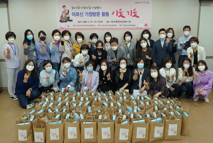 서울 강동구 암사1동이 지역내 소외되기 쉬운 이웃 170여명을 대상으로 마을 주민이 직접 방문해 안부를 챙기는 ‘이웃 기웃 프로젝트’를 진행하고 있다. 사진은 암사1동 어린이집연합회가 홀몸노인에 전달할 간식 등을 포장한 후 기념촬영을 하는 모습. (사진제공=강동구청)