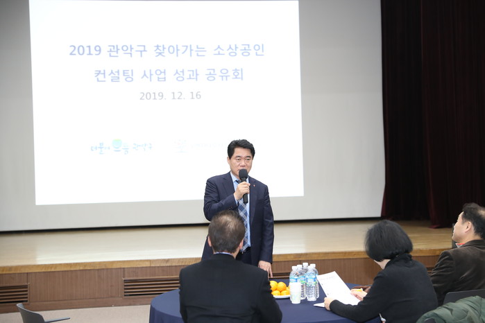 서울 관악구는 최근 구청 8층 대강당에서 ‘찾아가는 소상공인 컨설팅 성과 공유회’를 개최했다. 이날 컨설팅 참여자, 소상공인연합회원 등 70여명이 참석해 지난 컨설팅 성과를 공유했다. 사진은 박준희 구청장이 인사말을 전하는 모습. (사진제공=관악구청)